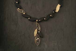 In Victorian England, black jewellery was very popular due to Queen Victoria’s mourning the death of her husband, Prince Albert. Unique onyx beads evoke the era and lace embossed gold completes the pun. The very high grade gold ore used as an inlay is from a mine in northern Ontario.