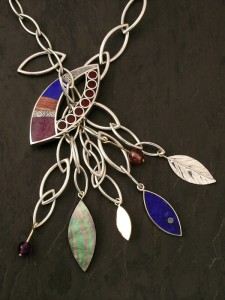 Sterling silver, 14K gold, pink tourmaline, amethyst, shell, various inlays