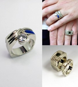 The diamond was the engagement diamond of the bride’s mother. The groom’s ring has an inlay of jade, custom cut to be more 3-dimensional like the brick like design in the ring.