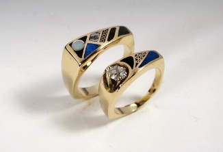 14K gold, diamond, inlays of lapis lazuli, opal, ebony, silver ore, bloodstone, 14K gold
