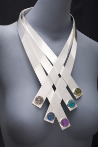 The Olympic symbol of 5 intersecting coloured rings represents the main regions of the world. This necklace has 5 strips of silver woven together with circles inlaid with coloured stones from different parts of the world.
