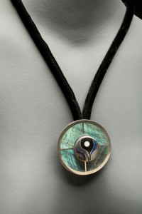 Their necklace is in the form of a stethoscope. In the centre is a stylized tree of life inlaid with various ‘healing stones’. The background represents the Red Cross and is inlaid with labradorite.